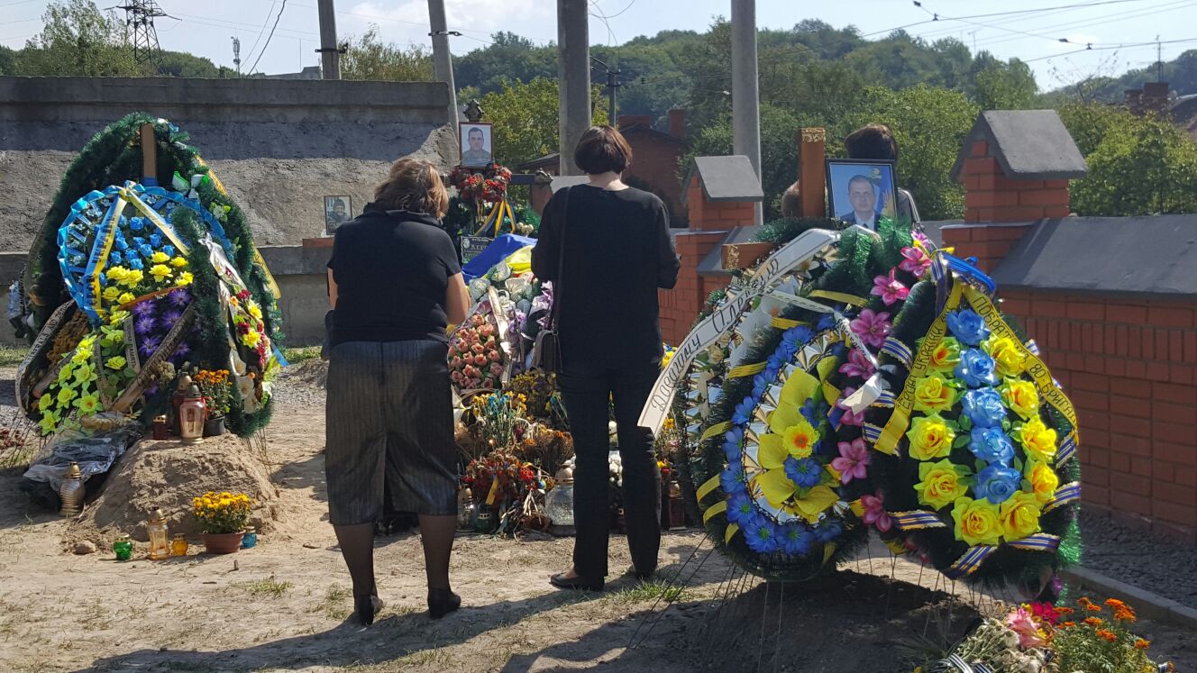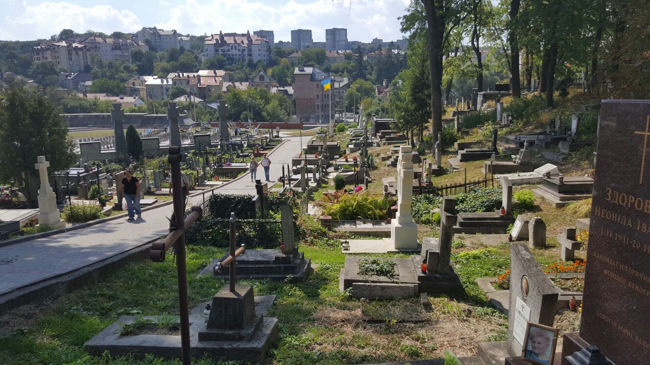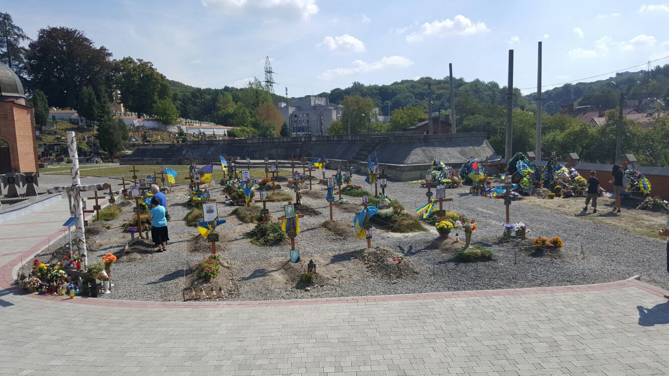 Na een ontspannen wandeling over een pad met negentiende-eeuwse graven werd ik plotseling met mijn neus op de feiten gedrukt. Ik was uitgekomen bij een nieuw, geïmproviseerd stukje begraafplaats met zeer recente graven. Alle graven waren versierd met Oekraïense vlaggen en geel-blauwe kransen. Grafstenen waren er nog niet, foto’s met informatie over de overledenen op houten kruisjes wel. Het waren allemaal jonge mannen uit Lviv, gestorven in de Donbass in een oorlog die nog altijd voortwoedt. Een van de graven was van een Oekraïense soldaat die nog geen twee weken daarvoor was gesneuveld. Net toen ik aan kwam lopen, verscheen ook zijn familie. De twee vrouwen, de man en het jongetje waren in het zwart gekleed en begonnen voor het graf te bidden. De headlines met de aantallen doden en gewonden las ik elke dag, de realiteit zag ik hier pas voor het eerst.